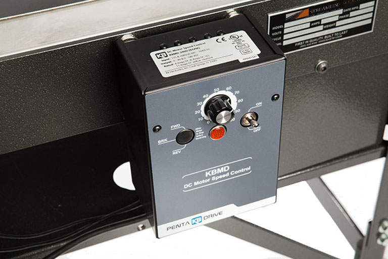 Streamline Packaging conveyors utilize an endless belt with self-tracking V-groove for consistent alignment. The variable speed drive motor is adjustable up to 100 fpm for a variety of applications. The unit also features a magnetic control box that can be mounted on either side of the conveyor. Conveyor legs are adjustable from 20” up to 33.5”. The system is designed to keep maintenance to a minimum and provide a fast and efficient method of product transport.