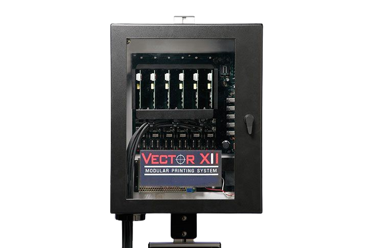 The Vector XII large character industrial ink jet printer offers the modularity and versatility that manufactures and contract packagers need. With the ability to print up to 12 lines from 6 print heads, the Vector XII large character ink jet printer has the tools you need to get the job done. 1″ and 1 3/4″ print head sizes are available offering six print sizes ranging from 1/2″ to 1 3/4″. The Vector XII system can also be programmed and maintained with a PC through a standard RS-232 port.